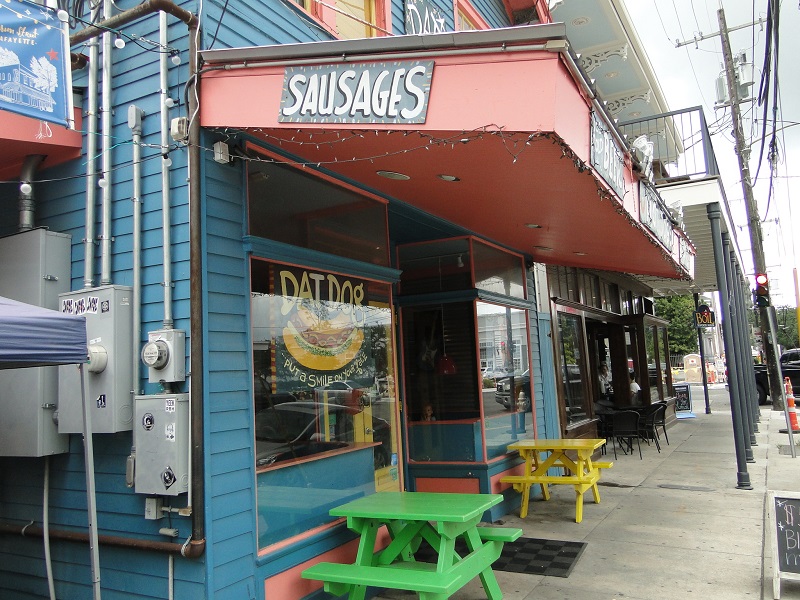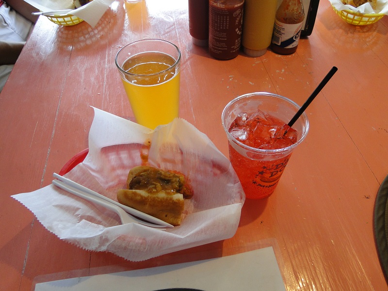 Stop No. 2 was Dat Dog, a hot dog restaurant. What’s that, you say? We went all the way to New Orleans to eat hot dogs? No, we ate Alligator Sausage Hot Dogs with crawfish etouffée. And Gail declared this her favorite of the five meals. Gail also had a Cane Brake Beer, while Russell had homemade Nectar Soda.