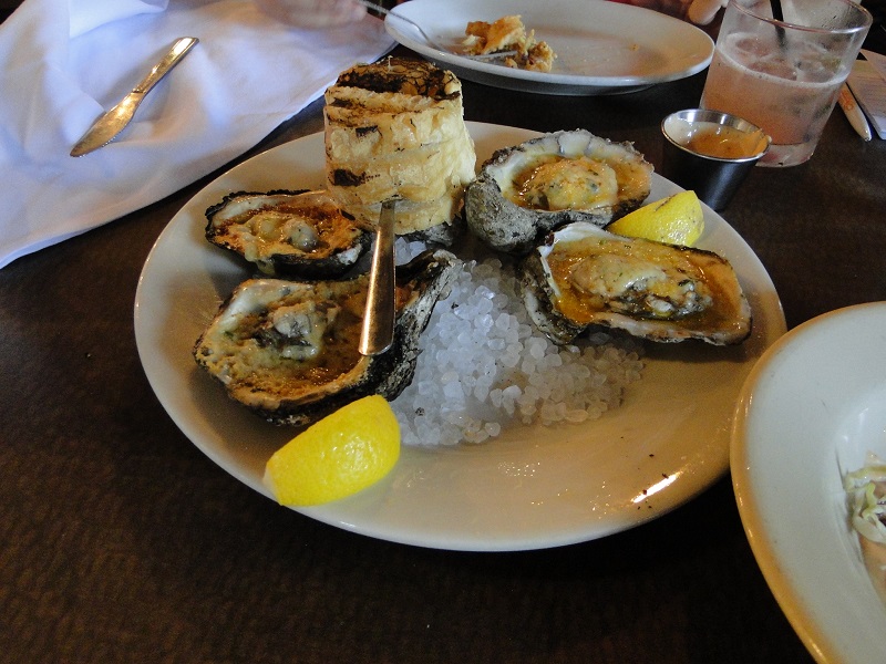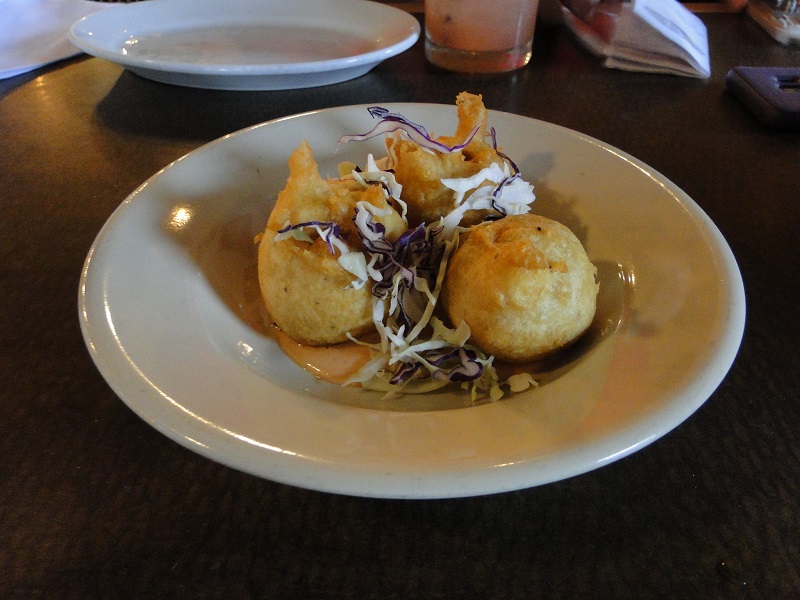 Stop No. 3 was Basin Seafood & Spirits. When we first arrived last night, our cabbie Sayid said Drago’s Seafood Restaurant in the hotel had the best charbroiled oysters in New Orleans. Mark said the ones at Basin were even better. These oysters are grilled with Parmesan and Pecorino Butter, and accompanied with a side of crab & crawfish beignets with remoulade sauce.
