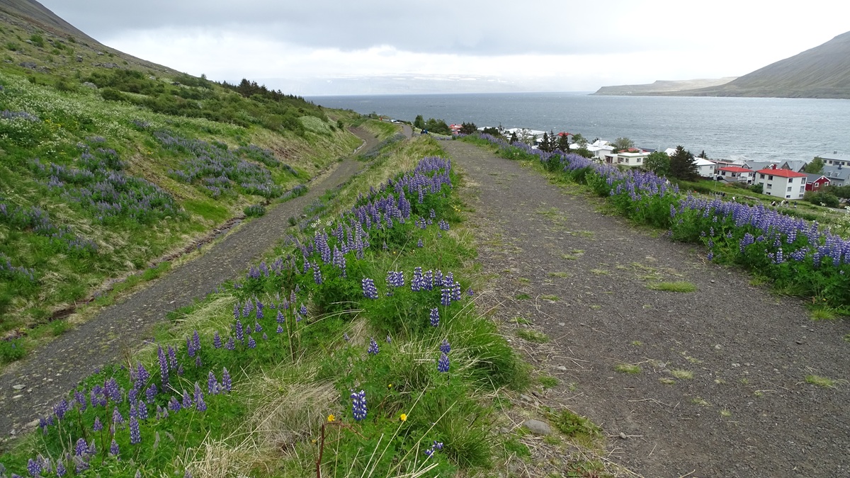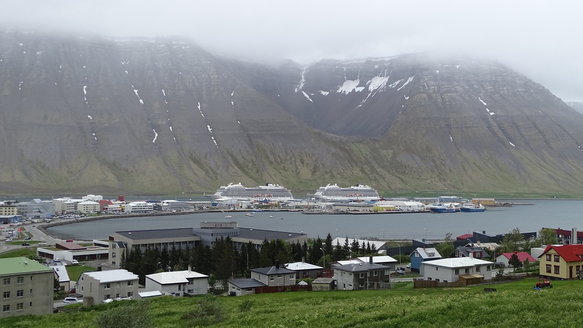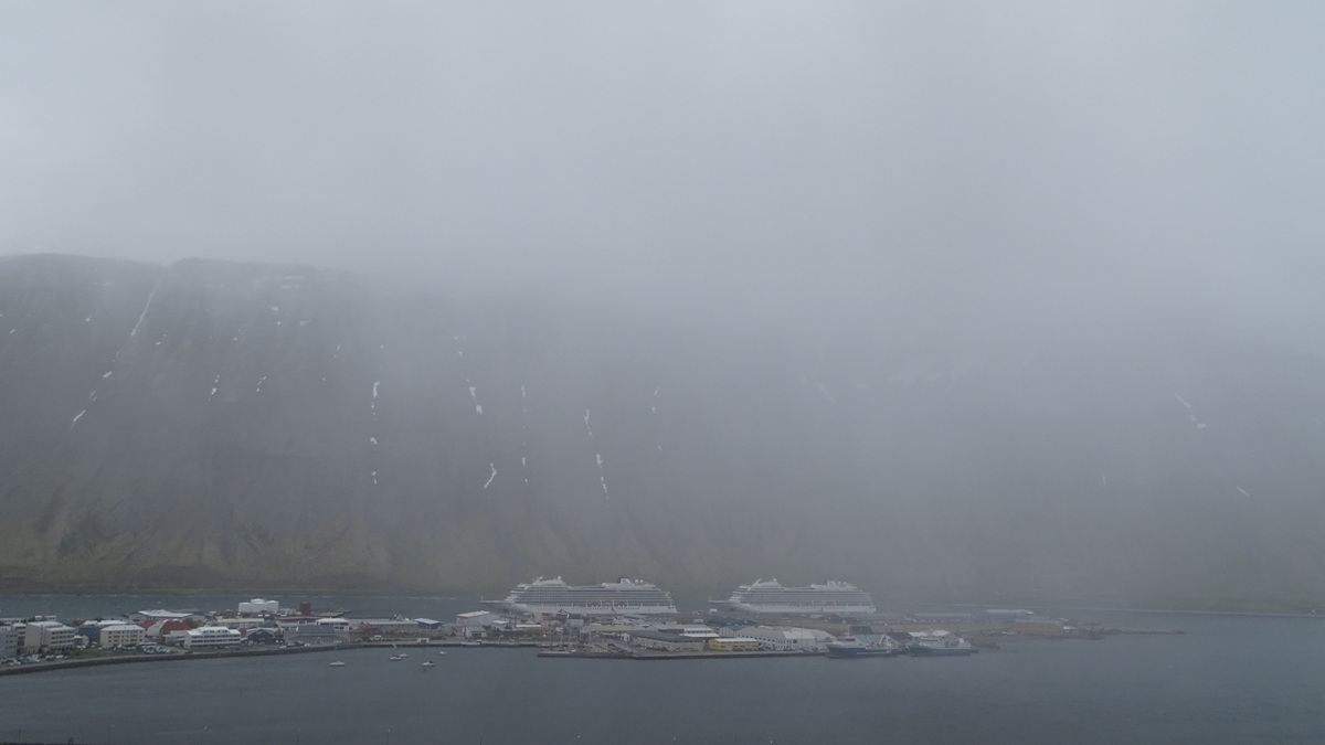 Today’s port was Ísafjörður (which means “fjord of ices”) on the northwest coast of Iceland. On previous trips we have done just about every excursion that Viking offers. Today there was a cold, biting wind with light snow flurries. Gail was content to stay aboard ship and continue working on New York logistics. Russell went for a hike up in the mountain across the bay from the ship.