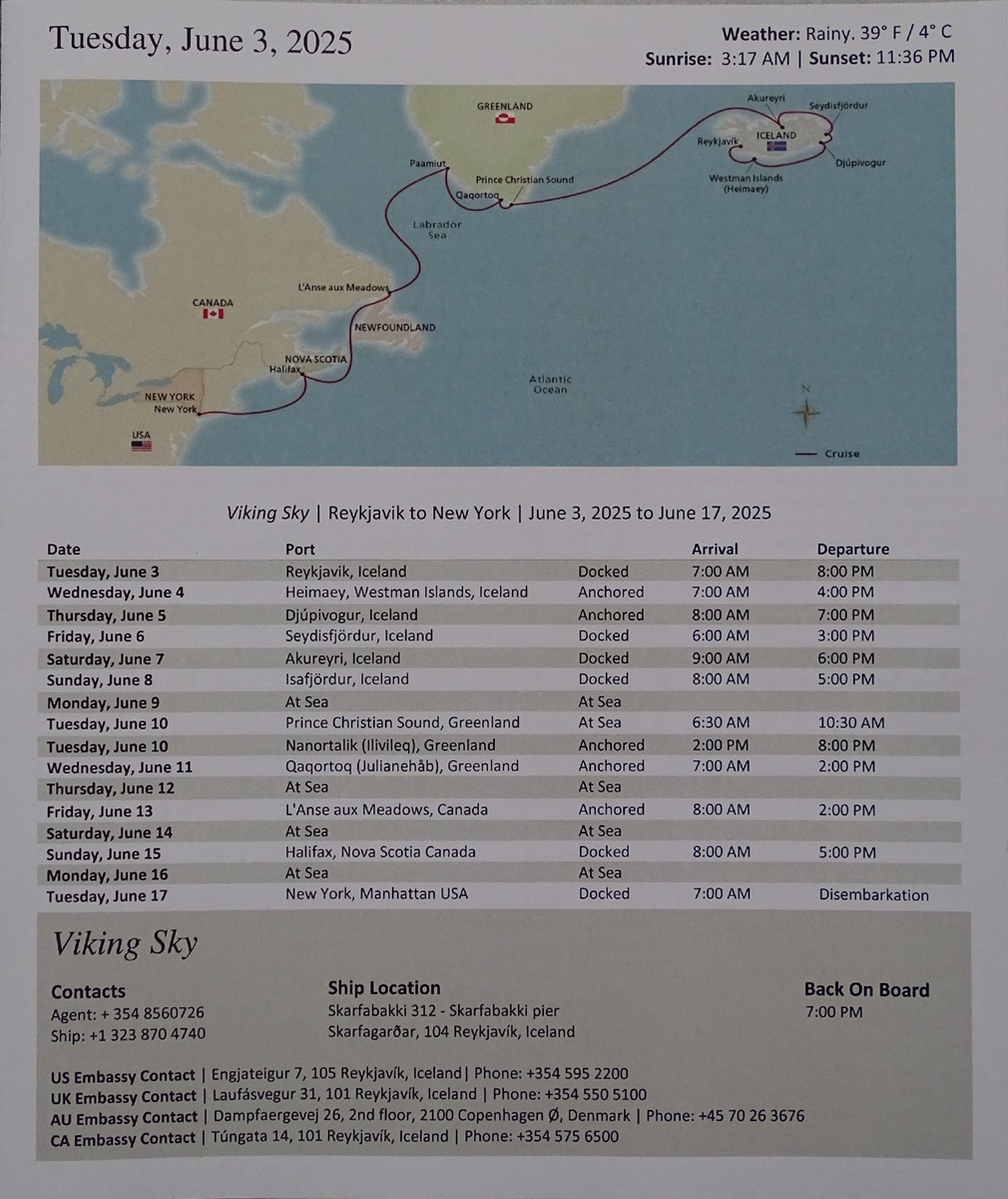Today is turnaround day aboard the Viking Sky. The 14-day “Iceland & Norway’s Arctic Explorer” itinerary comes to an end. The 14-day “Iceland, Greenland & Canada” itinerary begins. We are welcoming about 480 new guests on board. But there are also 450 “transit guests” – including 220 world cruisers – who will continue on to New York.