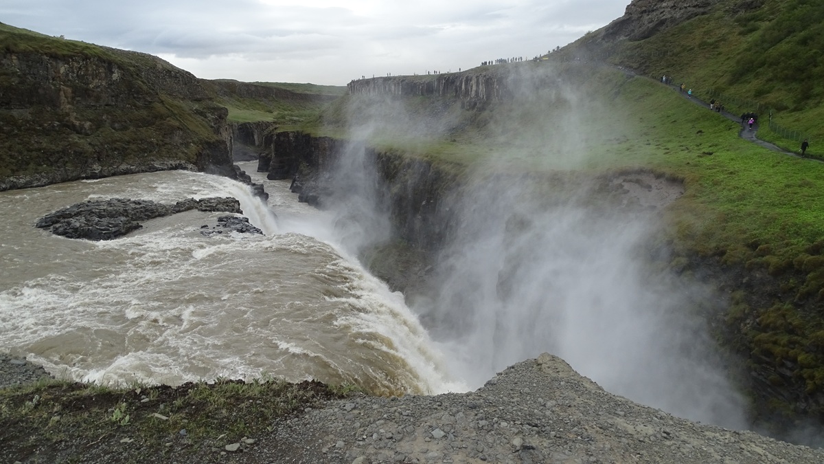 Our third stop was a short drive away: Gullfoss, which translates to “Golden Falls.” Gullfoss is arguably Iceland’s most famous waterfall. The Hvitá river plunges in two stages: 36 feet and 105 feet. The waterfall carries 5,000 cubic feet per second in the winter.