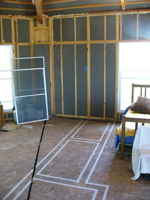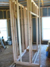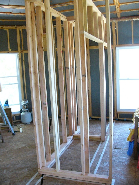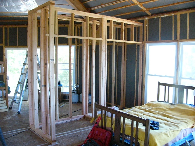By the time we arrived at mid-day, we were ready for work. The first walls on the agenda were the two master bedroom closets, which required full walls on the backs and sides as well as door-framed walls on the fronts.