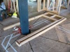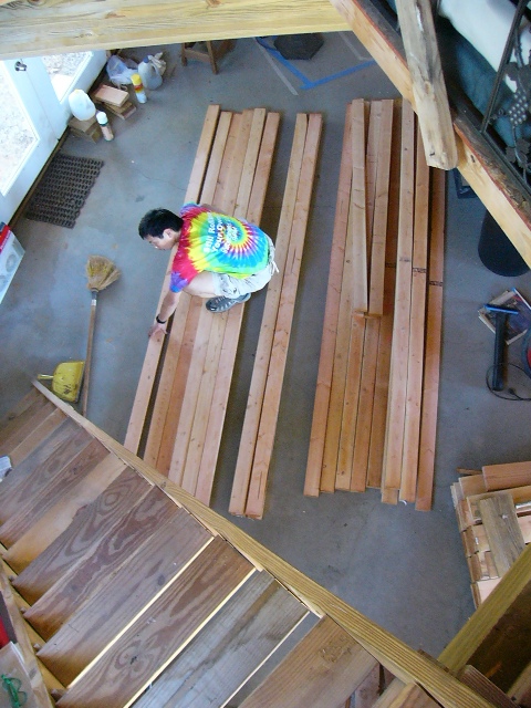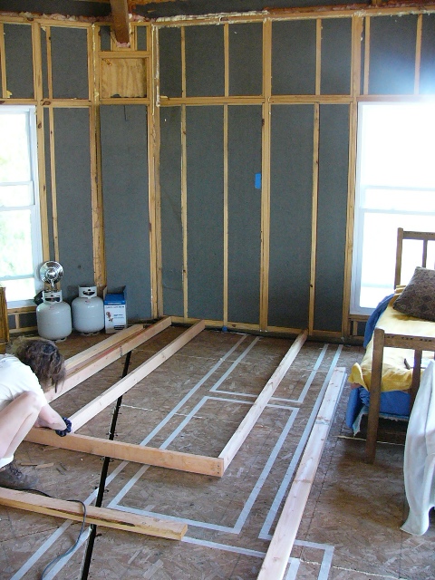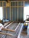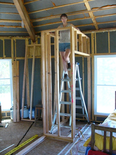 Gail was in charge of cutting and constructing. The chop-saw that we got from Gail’s step-father made cutting a breeze, but floor space for putting things together got increasingly scarce as we continued to install walls. Gail approached her tasks with her usual versatility, finishing walls faster than Russell could spec them.