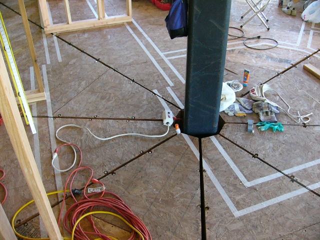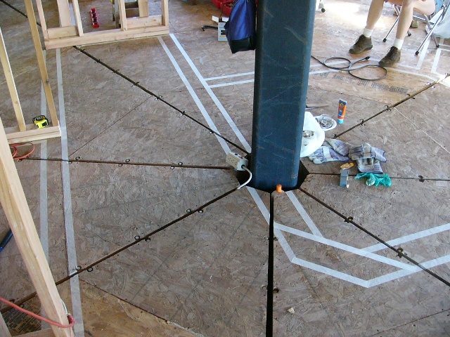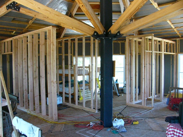Two questions emerge. First, how do we attach wooden walls to the metal center post to ensure stability? Second, how do we construct walls – and ceiling joists – around eight knee-braces that jut out at various angles?