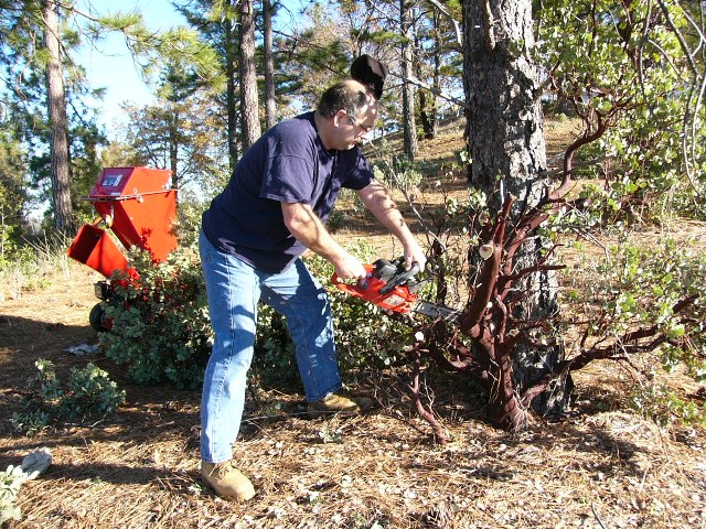 Meanwhile, Russell and Steve worked outside. Steve chainsawed and clipped Manzanita bushes; Russell put them through the chipper. It was a surprisingly sunny and warm weekend for November. We worked in short-sleeved shirts and enjoyed the sunshine.