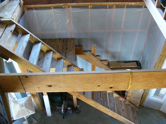 Russell’s next challenge: his stairwell construction is now blocked by the temporary stairs, as well as by relocated stacks of plywood