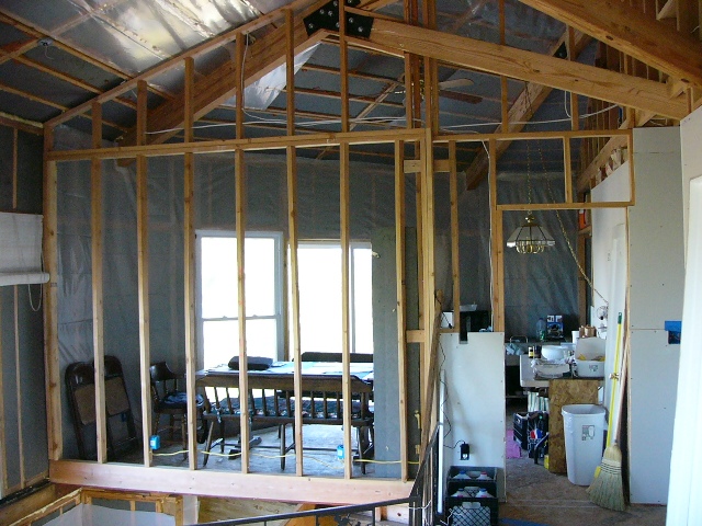 Russell constructed a platform across the stairwell hole, which Gail fortunately leaped across when a sheet of drywall fell on her