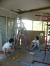Gail works on the ceiling (yes, she is straddling two ladders, one of which is half on the floor and half on a pile of OSB