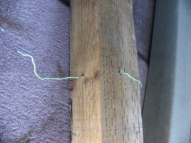 Our original idea was to drill holes halfway into two adjacent sides of a post. This would provide us with the maximum strength against cable tension. After we drilled one set of test holes, we decided that we had better confirm that we could actually get a cable through these holes.