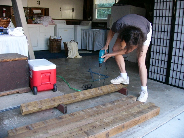The rest of the day went much more smoothly. Russell fashioned a jig to hold each post at a 45-degree angle under the drill press. As usual, the drill press was only able to drill partway through each post; Gail had to finish each hole with a hand drill.