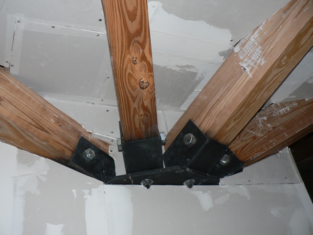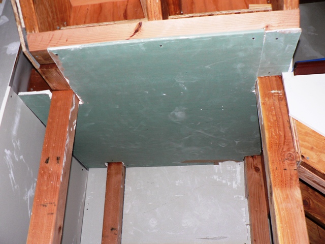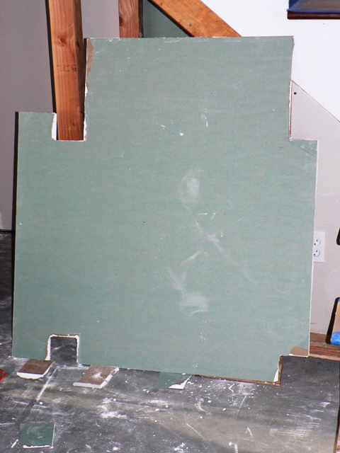 The walls and ceiling around the center post and beams required numerous tiny and difficult pieces of drywall spliced together