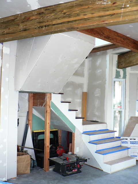 When Gail works alone, she is able to zoom through productivity. Her task for the remaining day was to begin drywalling the area underneath the stairs. After emptying out the clutter of tools, she drywalled the inside of the exterior walls, working around the pillars of the stair landings. She even drywalled under the top flight.