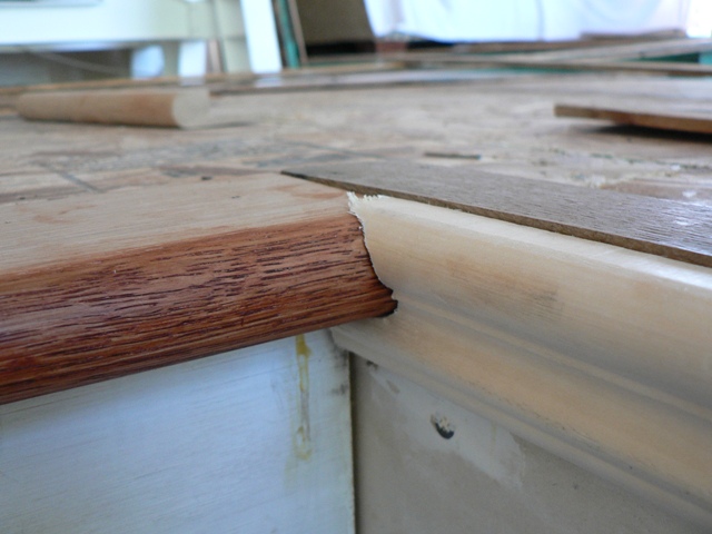 The second tricky factor was that the upper landing tread had to blend in with the second-story trim. Our original plan was to use 1/2” half-round trim to match the 1/2” half-round of the tread’s bullnose. Gail, however, had ended up buying a fancier trim at the lumber store. We had to figure out how to blend it with the tread bullnose. Then we had to cut the trim so everything would fit together. We got the splice made, but it took five different tools to accomplish it!