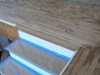 The upper landing trim, spliced into the landing tread, now stained cherry. (The trim will ultimately also be stained to match the tread.)