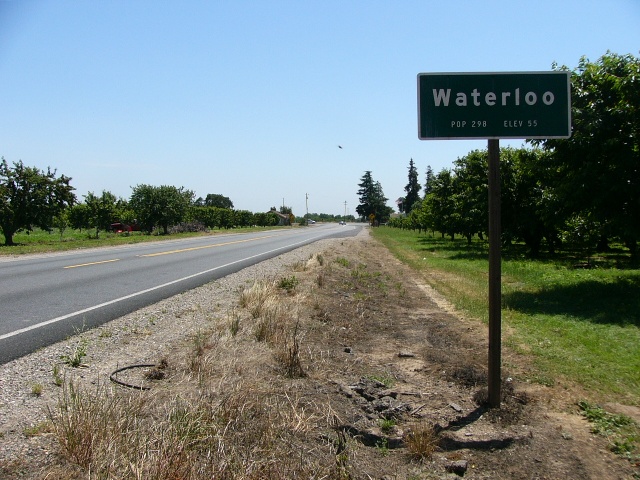 At 11:15 I arrived at the first of only two locations with food, the gas station at Kettleman Road, where I stopped to down a quart of cranberry juice. At 2:00, just as Frodo threw the one ring into Mt. Doom (hope I didn’t give anything away), I entered the town of Waterloo (population 298) marking the approximate halfway point in today’s walk.