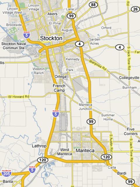 When we drive from Cupertino up to our mountain house, we regard the intersection of Highways 88 and 99 as a milestone. It is at this point that we leave civilization. The concrete and car-filled freeways give way to open fields and country roads. Because I am walking this same route backwards, I have anticipated that my arrival in Stockton would mean the opposite: a return to civilization.