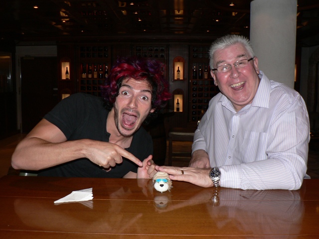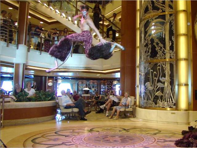 We have also befriended several of the entertainers. Nick Jones is a 31-year-old acrobat from Orlando, Florida, who is on ship as a “street performer.” He does a variety of “cirque” acts in the central piazza. He makes a good living doing what he loves, and Gail wants to put him in touch with our magician son, Joss.