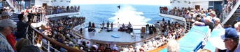 At 1:30 pm, the population assembled at the ship’s stern to celebrate our crossing the Equator. There is an associated ceremony that has been a nautical tradition ever since the days of the explorers. Gail had signed up as a “pollywog” and didn’t get picked, but our friend Vickie did. We won’t reveal the details of the ceremony for those who may someday experience it. Suffice to say that it involves hoisting the “Jolly Roger” and subjecting the pollywogs to a hazing that renders whatever they are wearing unusable for the future.