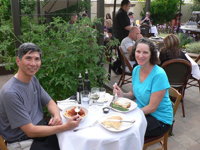 After last night’s incredible dinner, Lani gave us another restaurant recommendation. Today, we drove into nearby Lodi to eat at Pietro’s Italian Restaurant. We ate outside on the terrace, where opera music and the restaurant’s herb garden transported us to the Italian countryside for the evening. Russell got to have his favorite comfort food, spaghetti and meatballs.