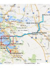 Okay, by now I had absolutely no idea what to do. I knew I had to be on Thornton, so I turned in the direction towards the Bay. What followed was an excruciatingly long voyage that took us past the towns of Centerville and Newark. Finally, with the Dumbarton Bridge in sight, we knew that we had somehow gotten turned around and were approaching the hotel from the wrong direction.
