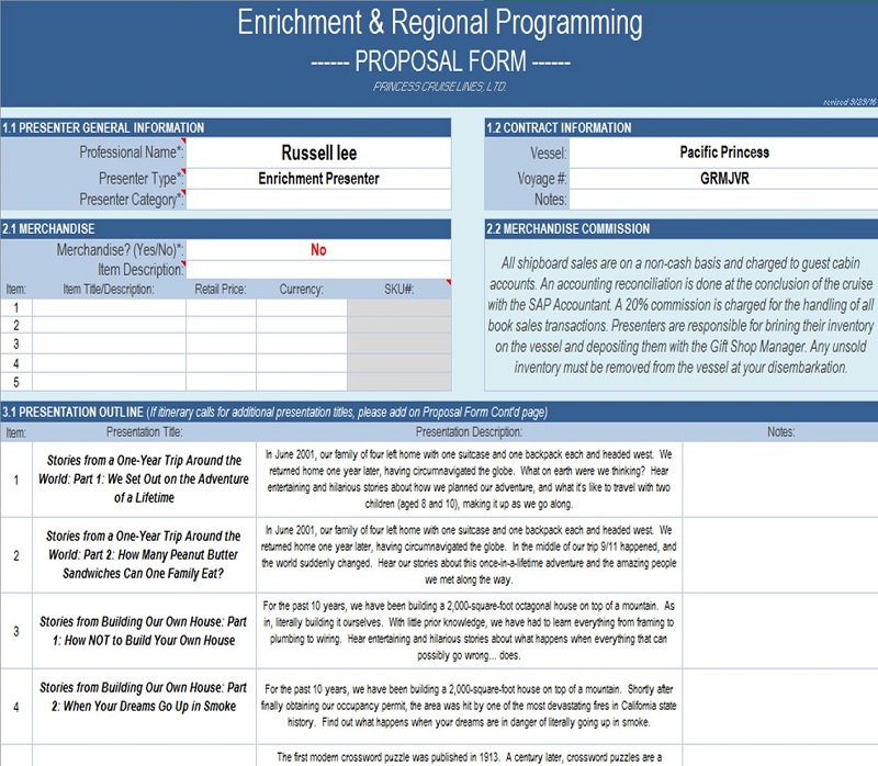 A year went by and we heard nothing. Then, in May 2015, Russell got an email from Princess. A summer intern had apparently been given the task of sorting through some of these resumes. They scheduled a phone interview, and Russell said he would be comfortable speaking at up to three cruises per year. The intern said they would put Russell into their speaker queue.