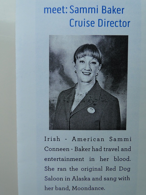 Our cruise director is Sammi Baker, a dynamo of a woman we also know from a previous cruise. When we met with her on Saturday, May 13, she had unexpected news for us: she didn’t need 11 lectures!