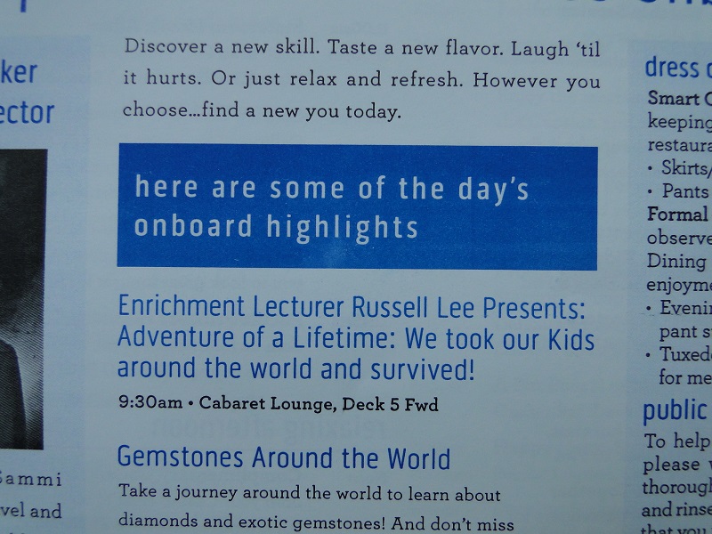 Nope, no one had let us know. Russell immediately breathed a sigh of relief. In fact, Sammi might not even need seven lectures. She was still working out the daily schedules, and there were several other activities she needed to slot in. Everything was subject to change. We would need to keep our eyes on the “Princess Platter,” the daily onboard newspaper/schedule.