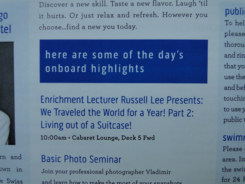 On May 16, we hosted our second lecture: “We Traveled the World for a Year! Part 2: Living out of a Suitcase!” We made some adjustments after our first lecture, which had run past the one-hour mark. We realized that passengers had other events to get to, including ping pong, bingo and trivia. So we tightened our second lecture to 45 minutes.