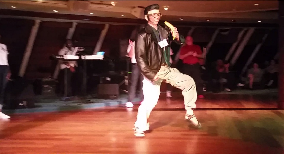 It'’s not “all work and no play.” Last night, Russell won a bottle of champagne impersonating Elvis Presley at the 50's Dance Party.