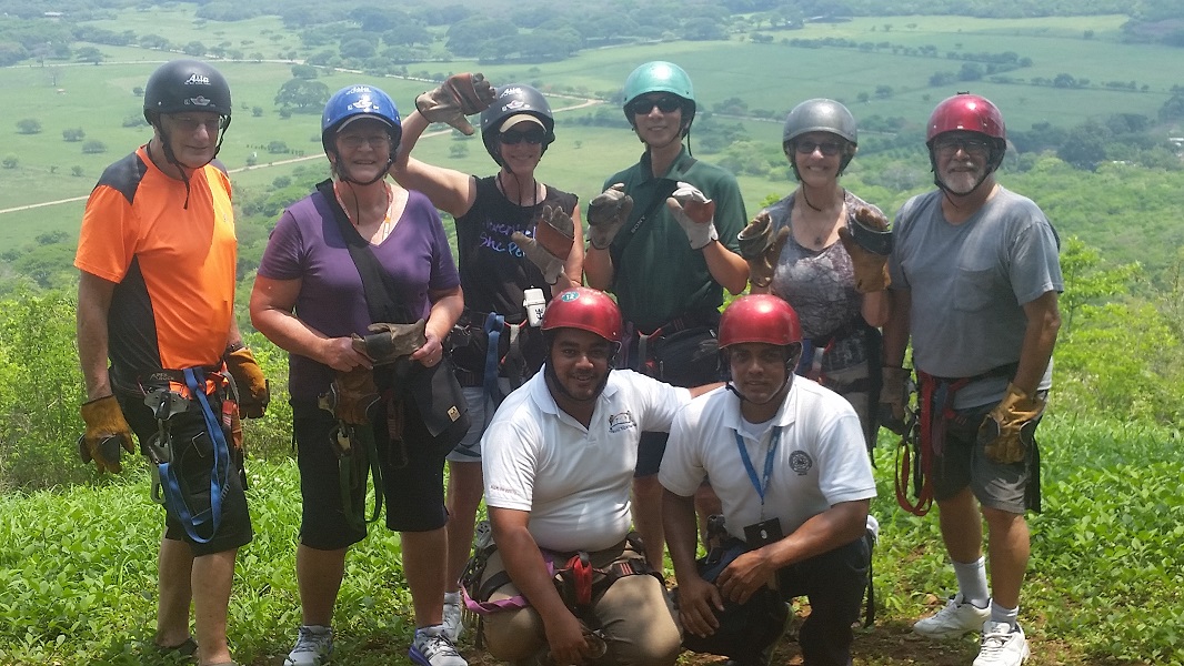 At this moment, another couple from the ship came wandering by. Ted and Marge are retired clergy from Melbourne, Australia. (They are hosting church services and Bible studies aboard ship.) They wondered what we were up to. Having never been ziplining, they declined to join us and went on their way. One minute later they came back. Marge and talked Ted into the adventure.