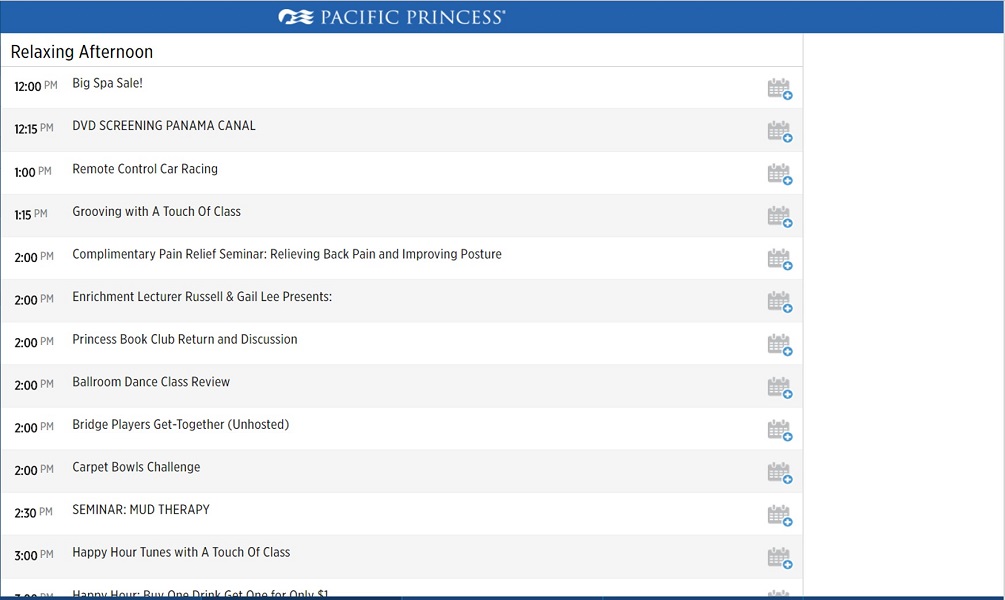 The online event schedule at Princess@Sea (note the blank lecture topic)