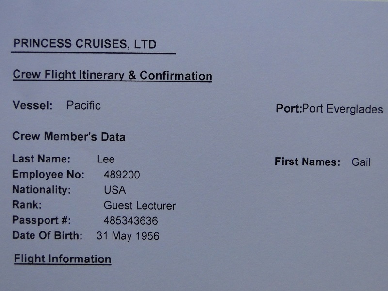 The best representation of our journey came from Princess itself. When we started this cruise, Gail’s status was “guest,” accompanying Russell as the Lecturer. But when we received our departure paperwork today from the crew office, Gail’s status was now listed as “crew.”