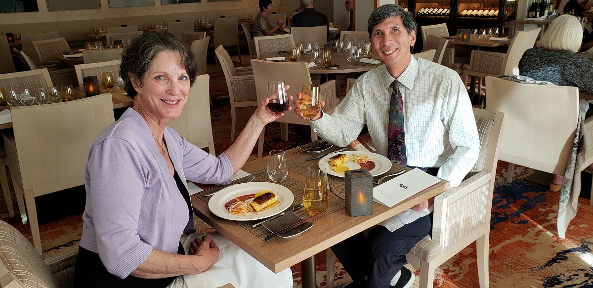 Back aboard ship at 1:30, our day only got better. Another responsibility for lecturers is to defer to the regular passengers. In addition to excursions, this applies to the specialty restaurants. We had good luck getting into Manfredi’s Italian Restaurant at the beginning of the cruise. Last night, we tried getting into the Chef’s Table specialty restaurant at short notice. Nicolas, the maître d’, said he had no openings but told us to come back tonight.