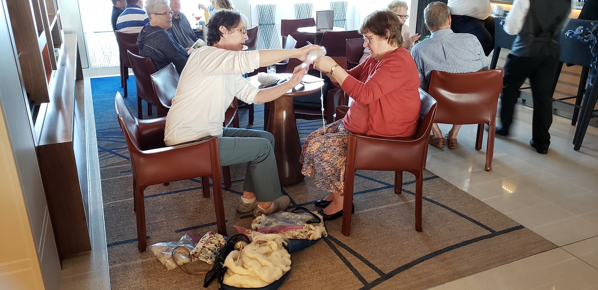 For days we have been sitting out in the public areas with me spinning and carding wool while Russell has been working on his talks or just chatting with folks. We have been promoting the heck out of this first talk. We were really concerned because the talk was exactly at dinner time.