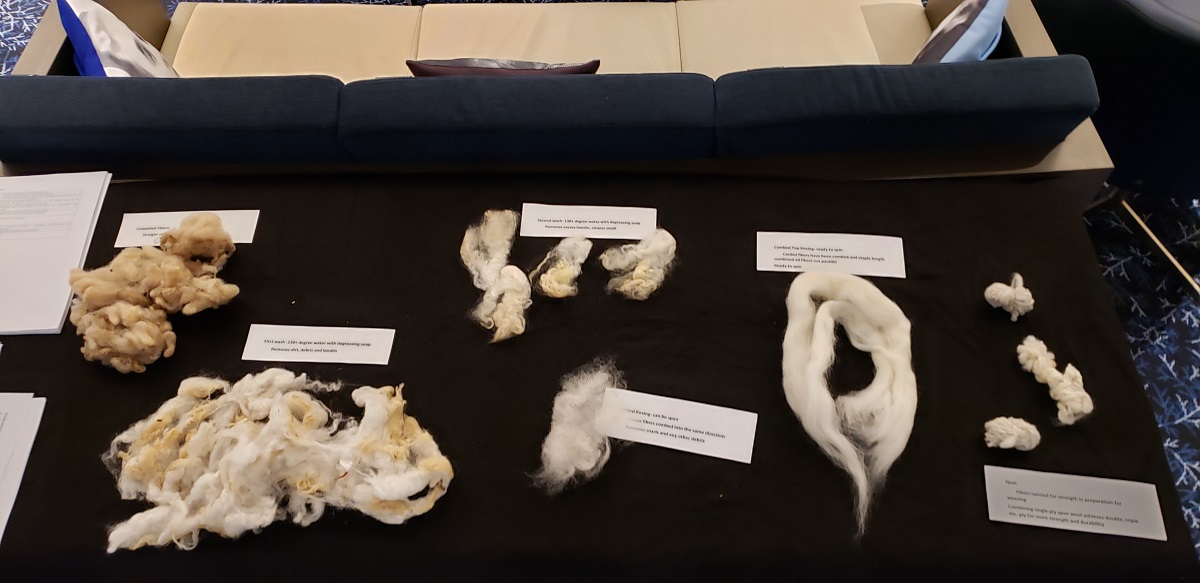 One thing we wanted to do that is out of the ordinary is engage the audience on multiple levels. In addition to the lecture I had two display tables with wool in various stages of prep – from raw unwashed… to carded… to spun. I had handout sheets with terms that come from the wool trade (“on tenterhooks,” “shoddy” and “distaff” are a few), plus family names that come from the trade (“Fuller,” “Weaver,” “Shaver,” “Shearer,” etc.).