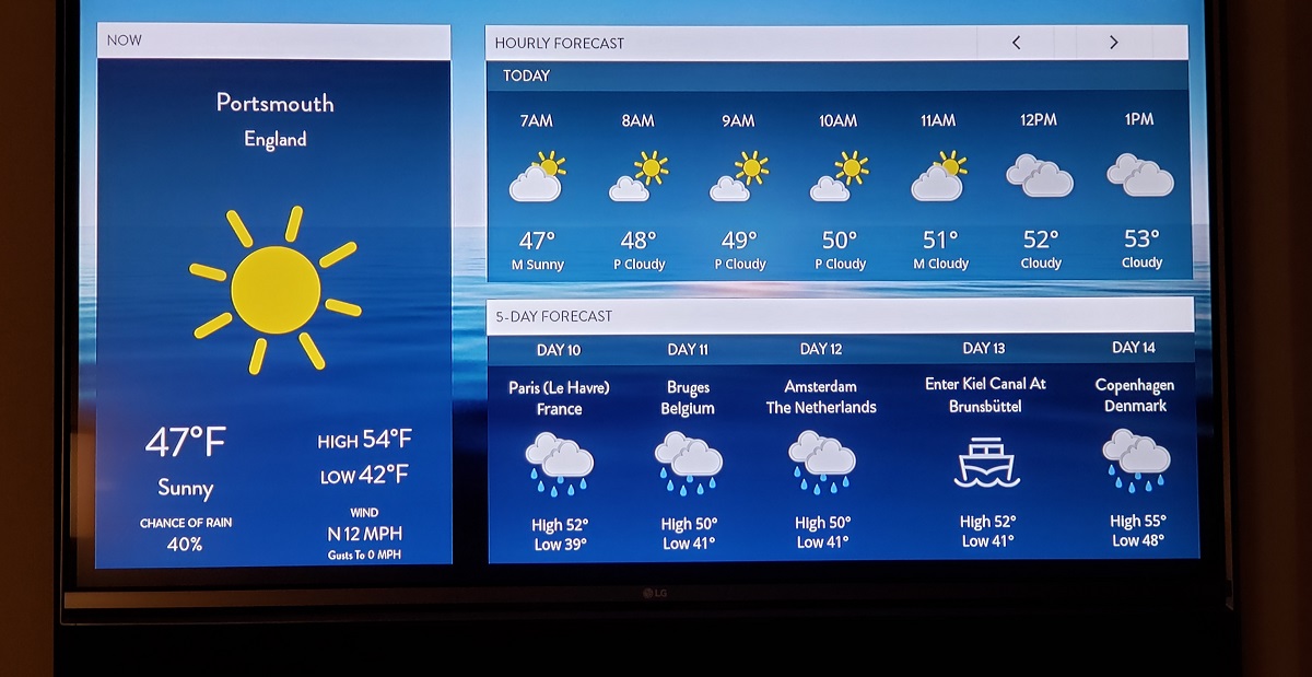 The forecast predicts rainy weather for the remainder of our cruise. We will lose an hour tonight when we set our clocks ahead. Gail has already cancelled her escort excursion tomorrow in Le Havre, France. And tomorrow evening, Russell will host his second lecture!