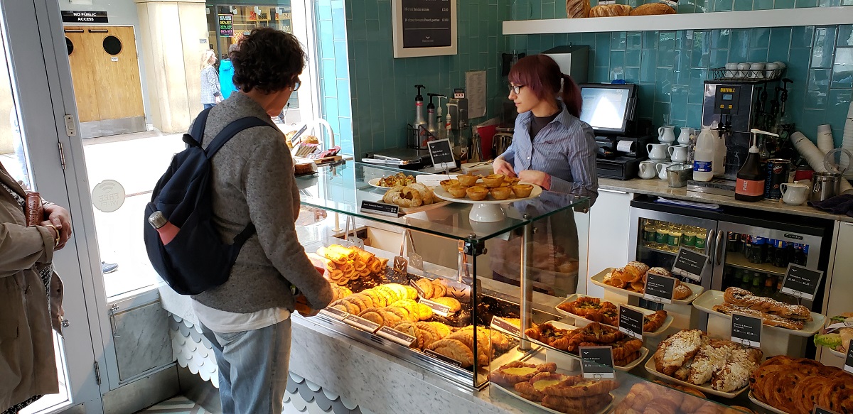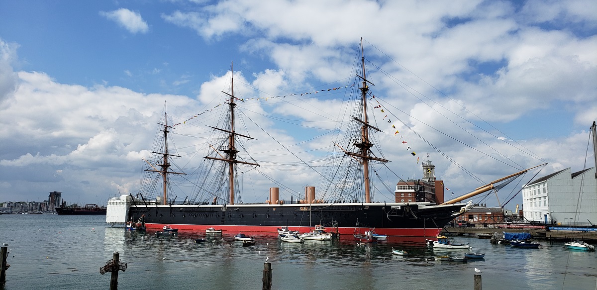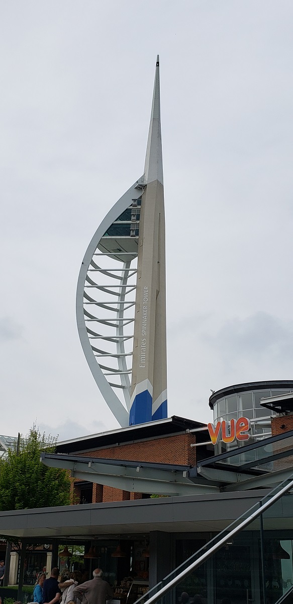 We went to the Gunwharf Quays, an outlet mall that had a Boots Pharmacy. This at least enabled us to get glimpses of the HMS Warrior (a gigantic battleship) and Portsmouth’s signature building, the Spinnaker Tower. We also stopped in at “The Cornish Bakery.” We are no longer in Cornwall, but this gave us an opportunity to have a meat pasty and a scone with clotted cream.