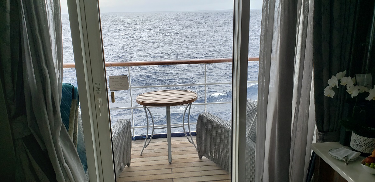 The cabin itself is about 250 square feet. The balcony (yet to be used due to chilly wind) is about 50 square feet. The room is tight but comfortable. It has a sitting area that can be closed off from the sleeping area. That is very, very nice as Russell is an early riser and I am a night owl.