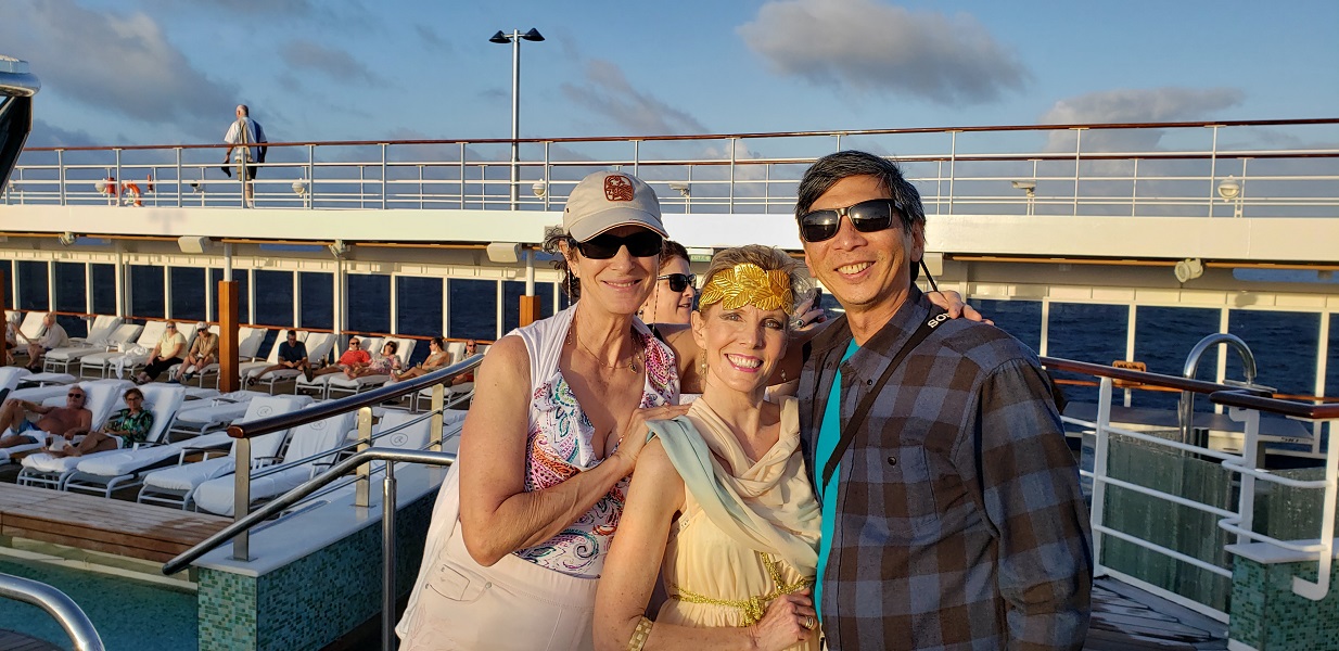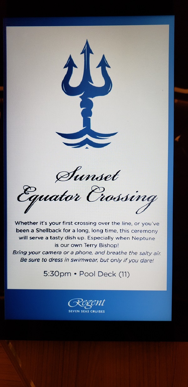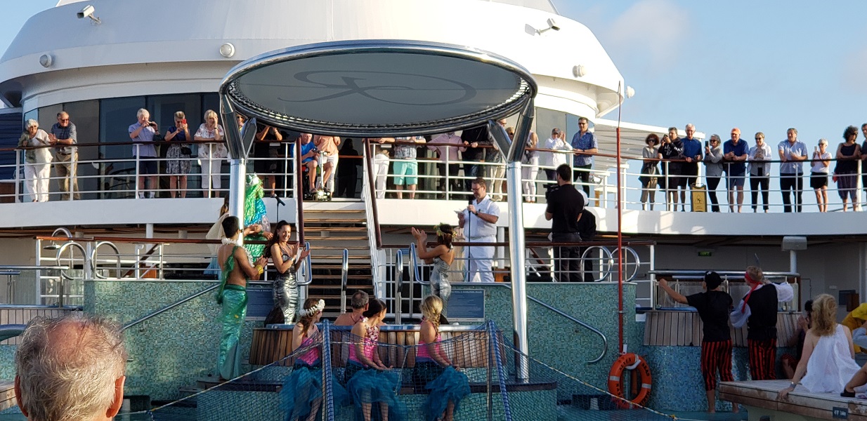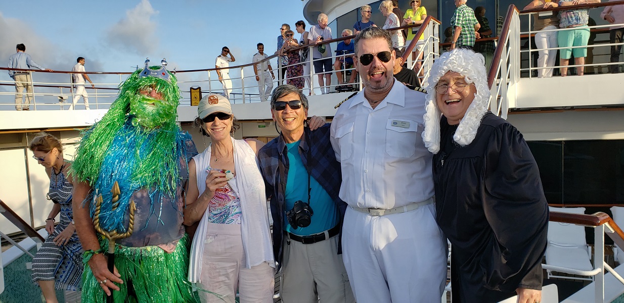 The night before and all day long, Andy the cruise director kept saying, “The pool will be closed, but be sure to wear your swimsuit.” He also clarified that though the actual crossing was closer to 8 pm (in the middle of dinner), we would be holding the ceremony at 5:30.