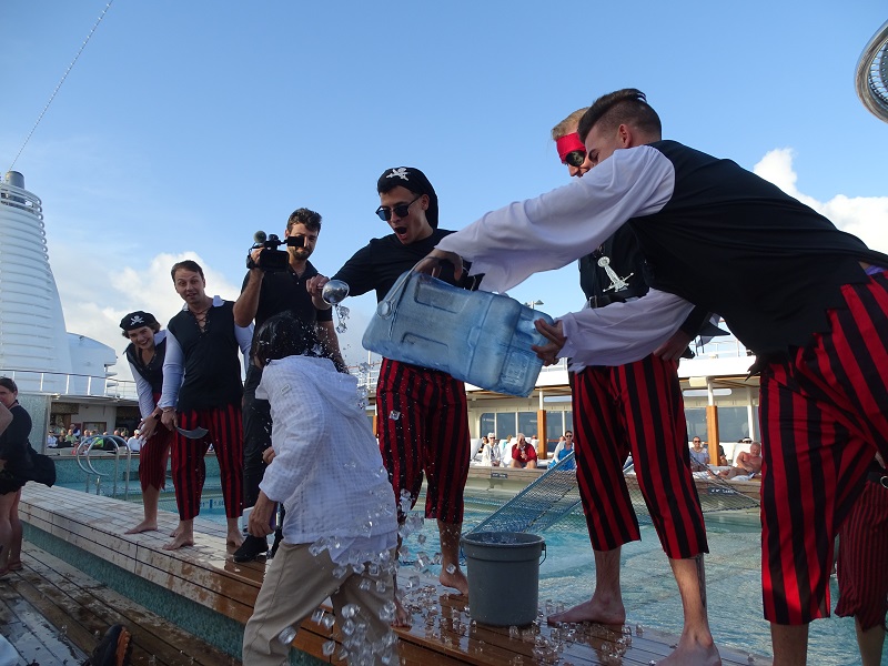 And indeed there were fish. Three of the “sailors” lined the pool edge, each holding a real fish. We had to kiss a fish… or three. On the mouth. A real fish. It was all good fun until the bucket of ice water showed up. As we went down the line of fish, it wasn’t apparent at first that there was more than fish kissing. But – oh my – there was. A big douse of ice water over your head. Once in line it would not be easy to get out of line, so there you are stuck facing off with the fish and expecting a cold douse. Yes, I kissed the fish. Ice went down my suit, my hair was soaked and I had a blast.