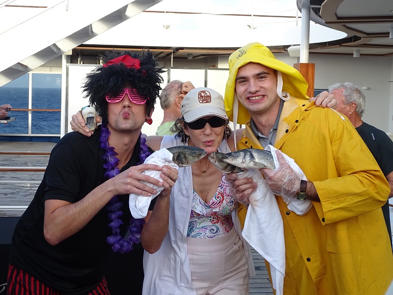 At 5:30 countdown started, and the entertainment crew marched out in formation from the upper deck down the stairs to the pool: sailors, pirates, mermaids, the judge (cruise director Andy), Neptune covered in seaweed (guest speaker Terry), Neptune’s wife (social hostess Tammie, also Andy’s wife) and finally Captain Aivo. Silly poems were read, then they told all the pollywogs to line up. We still didn’t know for sure what was going to happen, but it was becoming clear that fish were going to be involved.