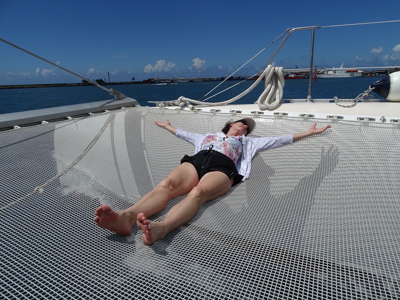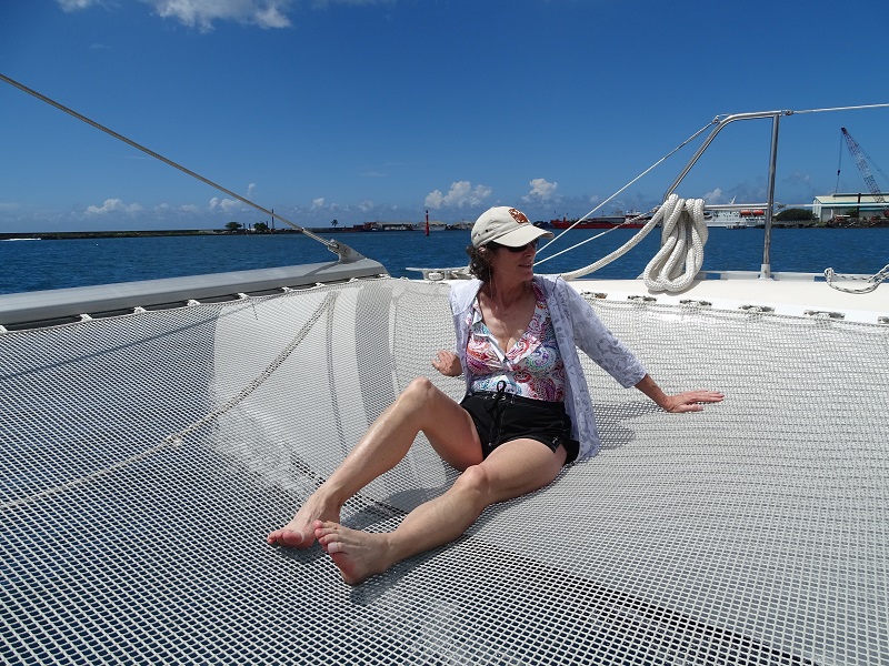 We had a much better time with our after-lunch excursion, “Sailing Escapade by Catamaran.” There was no bus! Instead, we walked right off the ship and onto a nearby 65-foot Maxi catamaran. We sailed for two hours from Papeete down the west coast of Tahiti. Once we entered a lagoon past Taapuna’s Passage, we were able to snorkel for an hour at a nearby coral reef. Gail couldn’t snorkel due to her recent ear surgery, but she was content to float in the water with fins and a foam noodle while Russell snorkeled.