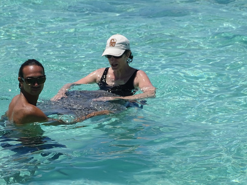 Petting sharks in Fakarava was amazing. Holding and petting river eels in Moorea was so cool. But this… THIS was mind blowing. We were lowered chest deep in the water. I don’t snorkel but I could still easily see everything in the water. Puffer fish swam by. Black-tipped reef sharks went by in large groups and circled us. And the rays floated along within arm’s reach. They fly in the water. So graceful. I was able to touch then hold a ray as she snuggled up to me. The rays are smooth in the center of the back, and as you move to the edges the skin turns sandpaper rough. And of course, I am letting the world know how exciting this is by exclaiming regularly “I touched a ray!” One of the guides who was in the water with us exclaimed, “I LOVE MY JOB!” I could have stayed much longer, but the reef snorkel was waiting.