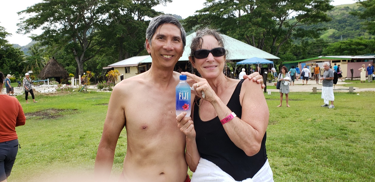 We were lucky that our group of about 15 people had our massages first – so, on clean skin. These next folks had theirs after the mud. And this mud does not give up easily. I ran to the shower room: one stall, cold water only. I stripped off the muddy clothes and set them up on top of the half wall, like putting them on the floor would make them dirty. Duh. I tried to just rinse the mud off. But when I toweled off it was clear that I needed to use soap. I tried again and still the towel was dirty. Time was short, so I gave up and collected my things to step out and change to my clean clothes. I would shower better on the ship.