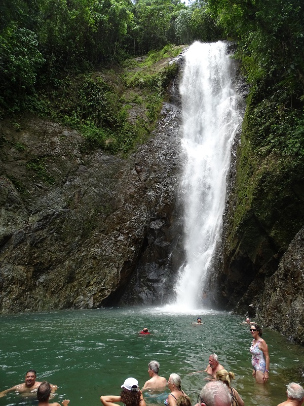 By the time we got there, many of the other folks were already in the water having fun, so I went in to join them. My word, the water was cold, and I about changed my mind. But another passenger motioned me over to him and I had to swim to get there. Once I made that plunge, I decided to go all out and try to make it to the waterfall itself. He and I pulled ourselves along the rock wall.