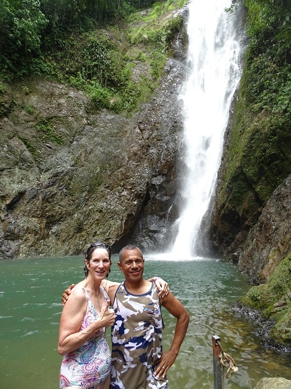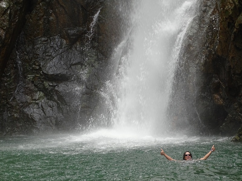 The next stop was still 20 minutes upriver, so the guys got back onboard and off we went. I had no real idea what we were heading into… but you’ve seen the travel shows with a thundering waterfall plunging into the clear pool at the bottom? Well that’s it! It was a stunning scene.