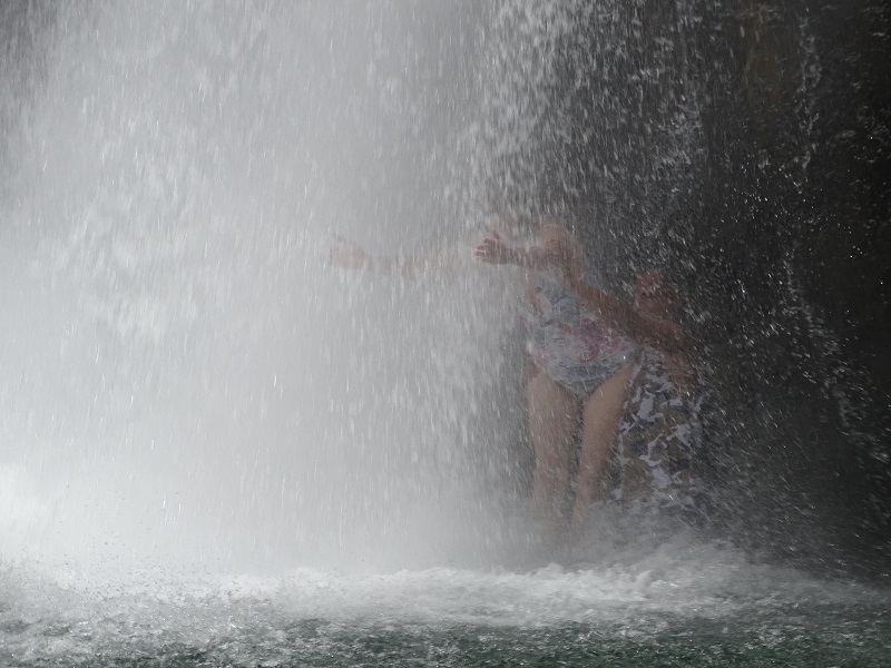 Once we agreed I was okay, Bill told me to follow him and he would take me behind the waterfall. What? Really? Now I am an okay swimmer, but the current and the spray made it really hard. Bill shouted, “Take my hand and kick,” and finally we made it back across. We went backwards along the rocks toward the falls until we were behind. He shouted, “Keep going until your bum hits a rock ledge, then sit there”. He sat next to me. Then it was, “Now stand on the ledge and reach your hand through the water.”