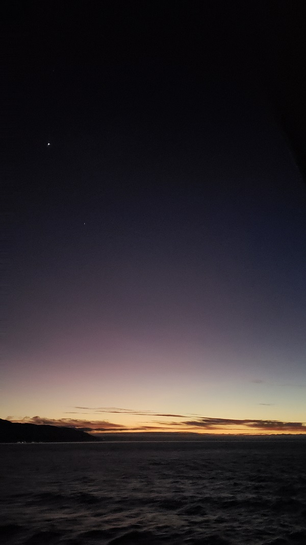I had gotten up super-early at about 4:30 and stayed up to watch the sunrise. It was cold out on the balcony, but I bundled up in my robe and slippers and waited. I was finally rewarded with not only a lovely coloring of the sky but the last stars in the morning sky. The only problem was that I was tired again at 7 and climbed back into our warm bed and fell asleep. I did not see our arrival in Wellington other than the welcoming dolphins and the pilot boat arriving at our side.