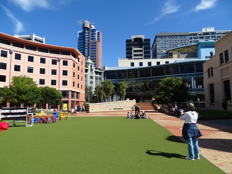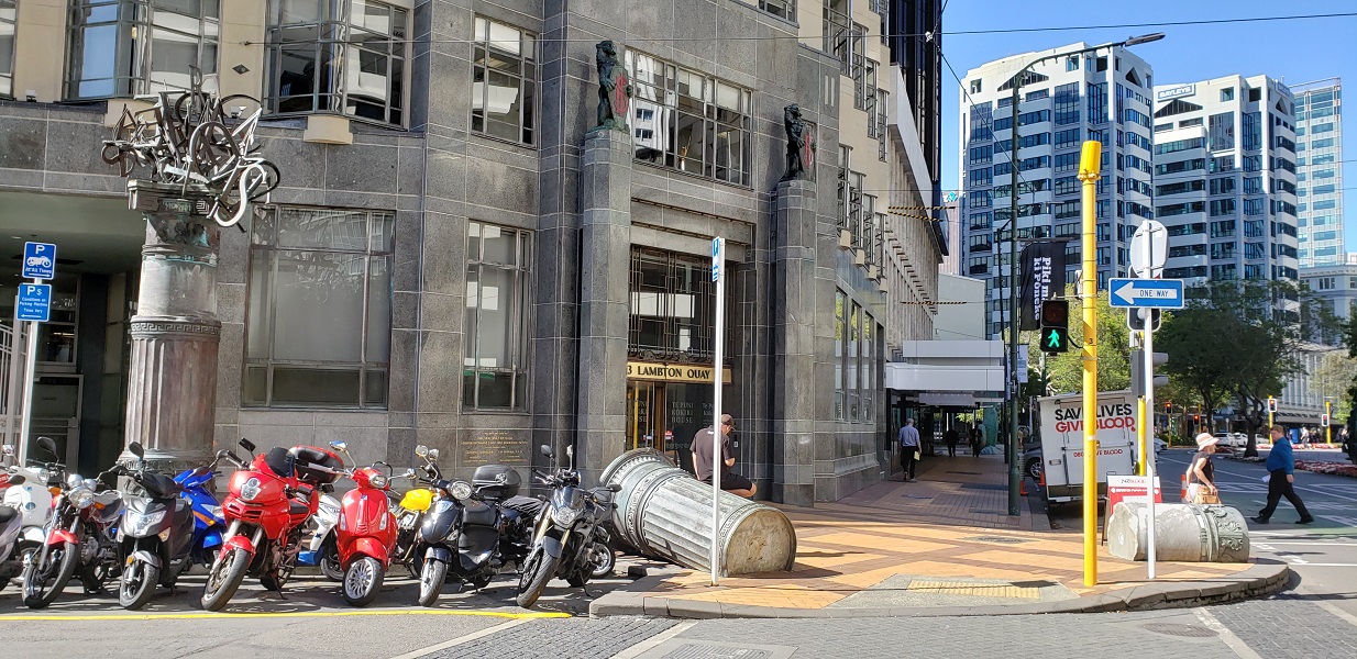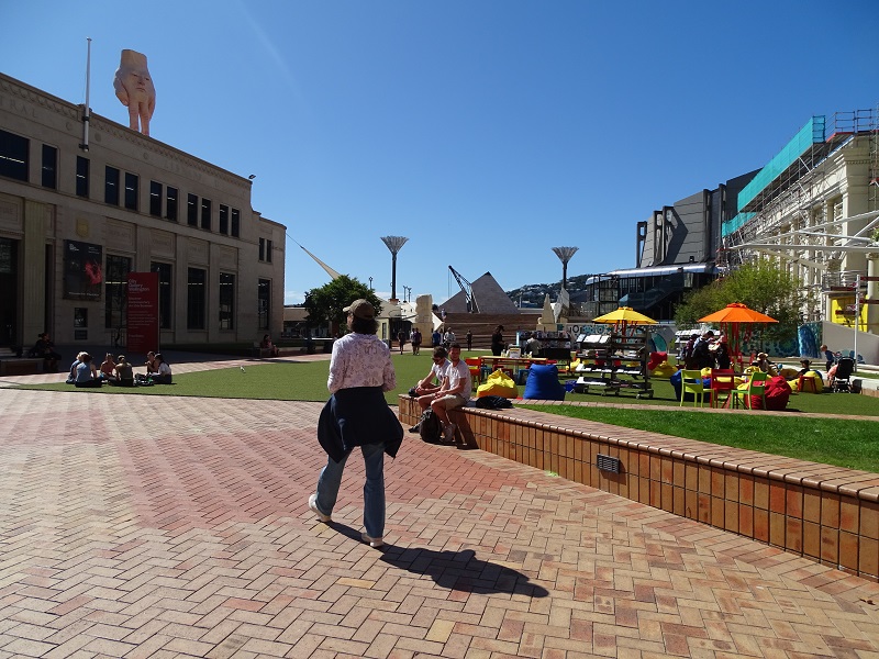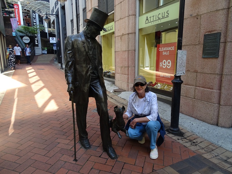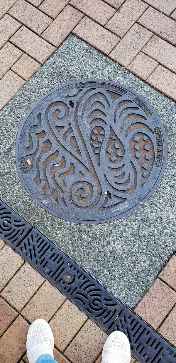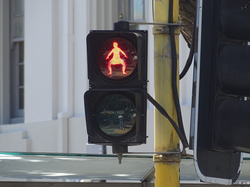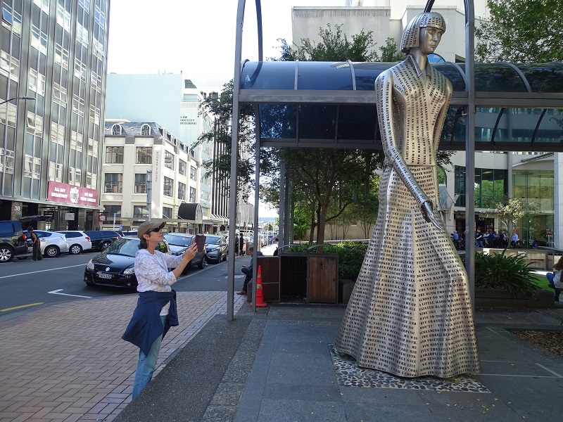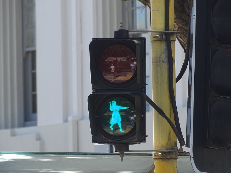 Wellington has some great street art and I was enjoying taking all the photos I could. Earlier Russell had mentioned a streetlight that had a Maori warrior as the crosswalk signal, but he didn’t think we would find it. Well, getting lost sometimes helps. He ran across a street and I waited for the signal. And suddenly there it was! It didn’t last long but we got photos of the “Walk” and “Don’t Walk” icons. Suddenly we realized that we had better get to the shuttle bus stop, but got a bit turned around. There was so much more art to see, but our excursion waited.