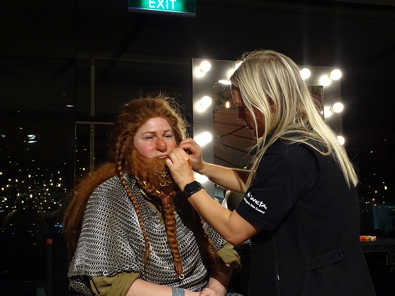 It was here that we stepped into a non-descript building and were treated to a one-hour tour of Weta magic. Our guide was Rebecca, whom we recognized as one of the roving elves from our Auckland Middle Earth dinner. (It’s 400 miles between the two cities; we wonder how all those actors got back and forth.)